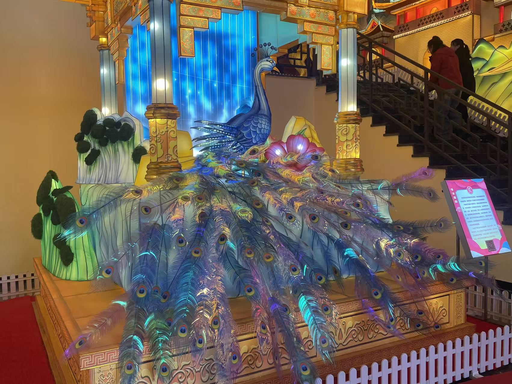自貢彩燈素有 “天下第一燈” 美譽(yù),其工藝歷經(jīng)千年淬煉,從漢代井鹽開(kāi)采時(shí)期的雛形,到明清 “獅燈場(chǎng)市” 的興盛,如今已發(fā)展出立體絲扎、分色裱糊、瓷器捆扎等數(shù)十種核心技法。意樹(shù)文化團(tuán)隊(duì)深諳此道,在創(chuàng)作中既堅(jiān)守 “美工放樣、鉗工造型、焊工固定、裱糊上色” 的傳統(tǒng)工序,又融入 LED 節(jié)能光源、AI 互動(dòng)等現(xiàn)代科技,更創(chuàng)新性運(yùn)用特色材料,讓每盞花燈都成為技藝傳承的載體。如工匠們將以 45 度角精準(zhǔn)裁切按紋理緊密粘制成孔雀翎羽,燈光透過(guò)的天然紋路,盡顯生靈的靈動(dòng)質(zhì)感。